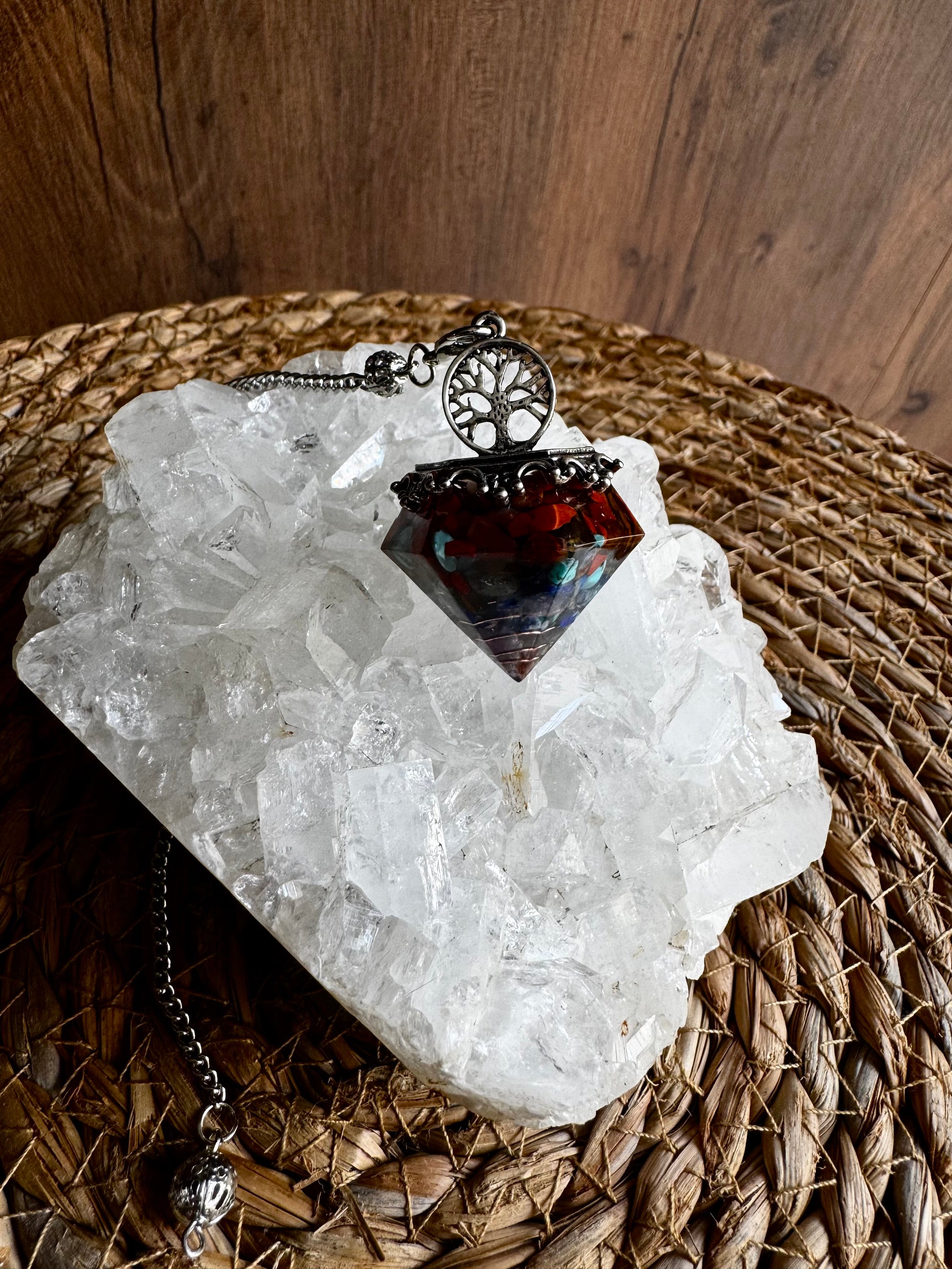 Este péndulo estilo orgonita, coronado con el símbolo sagrado del Árbol de la Vida, es una poderosa herramienta para quienes buscan armonizar cuerpo, mente y espíritu. Su interior combina metales y resinas que canalizan y purifican la energía, ayudando a neutralizar radiaciones y limpiar espacios o campos áuricos.