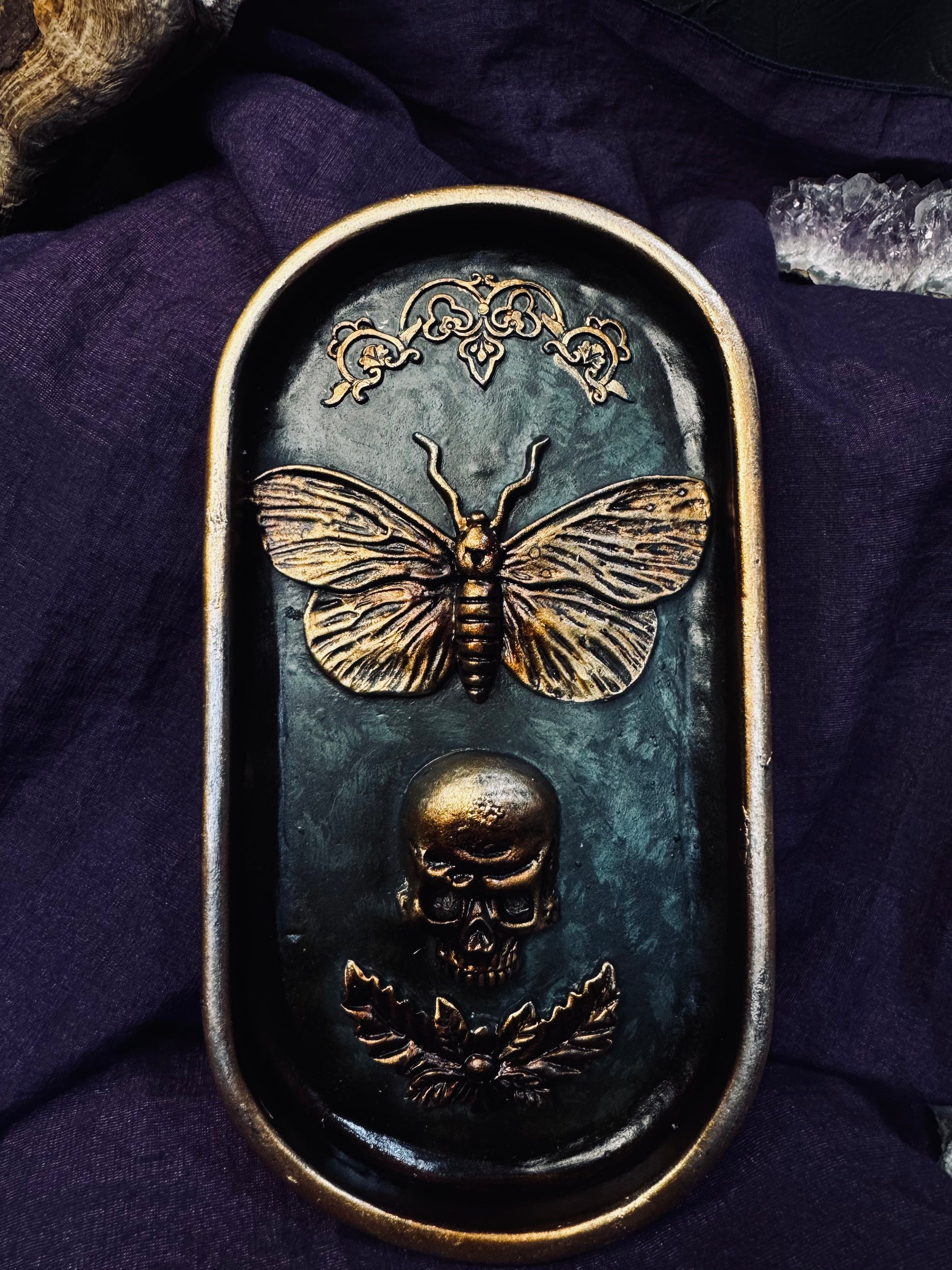Un diseño único, lleno de misterio y elegancia oscura. Este incensario combina la fuerza de la calavera con la magia transformadora de la polilla, todo ornamentado con detalles dorados que lo convierten en una auténtica joya ritual. 🔥🌙