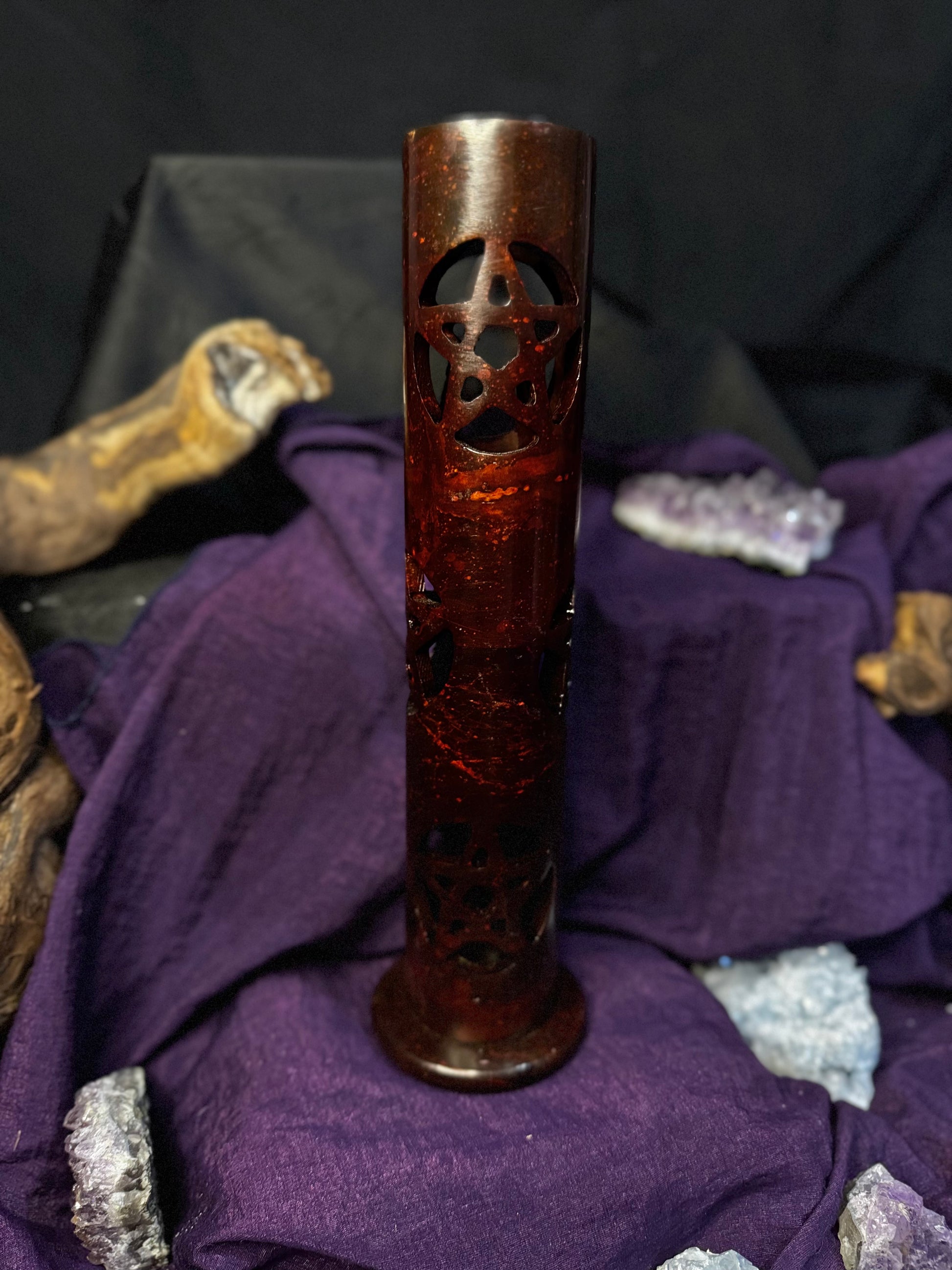 Un diseño único en piedra que simula una pequeña chimenea, decorada con pentagramas protectores. 🌙⭐ Perfecto para quienes buscan un ambiente cálido y mágico en su hogar, mientras el humo del incienso se eleva creando una atmósfera mística.