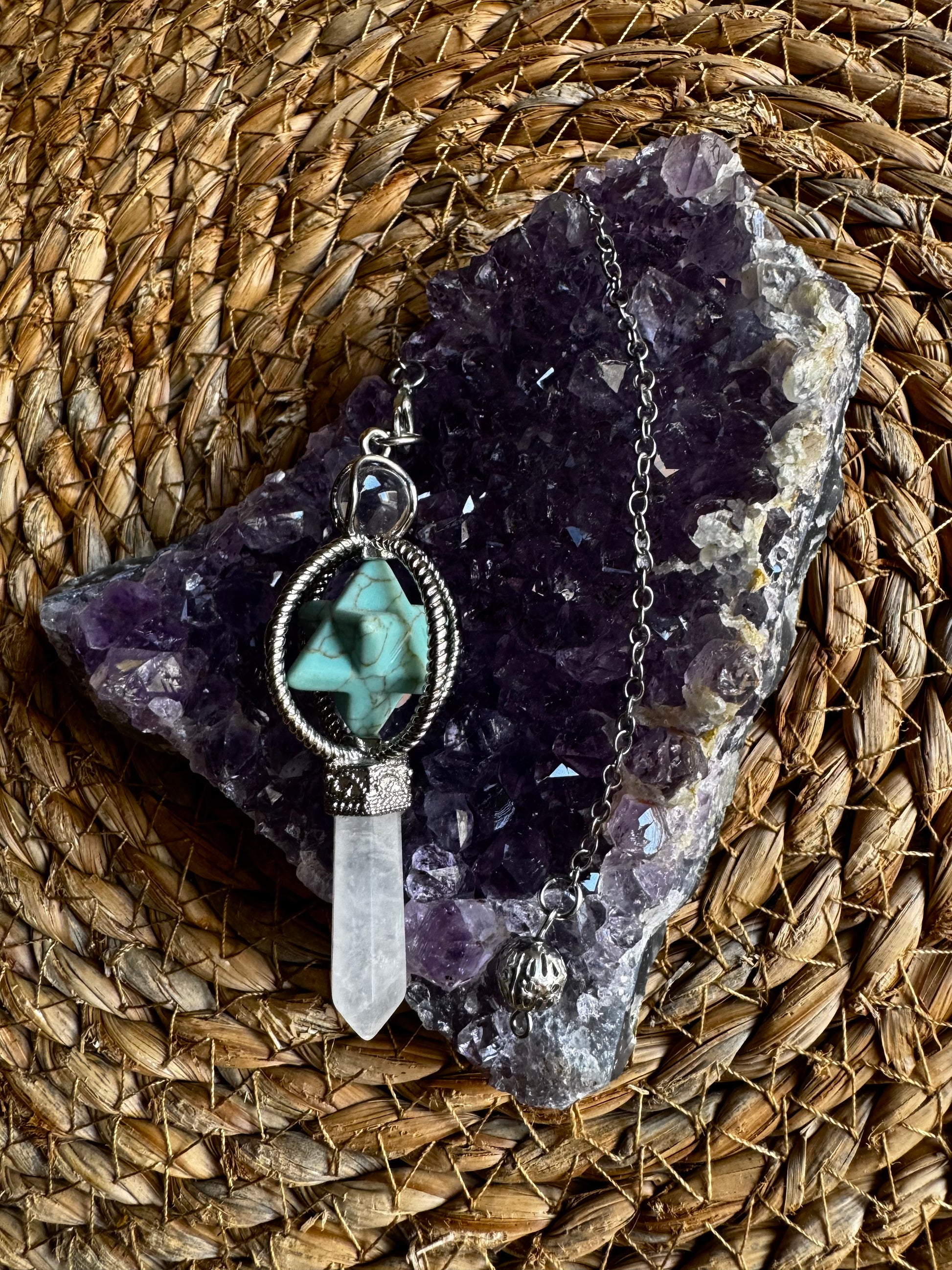 🔯 Péndulo Merkaba de Turquesina con Punta de Cuarzo Blanco – Protección, claridad y expansión espiritual 🔯