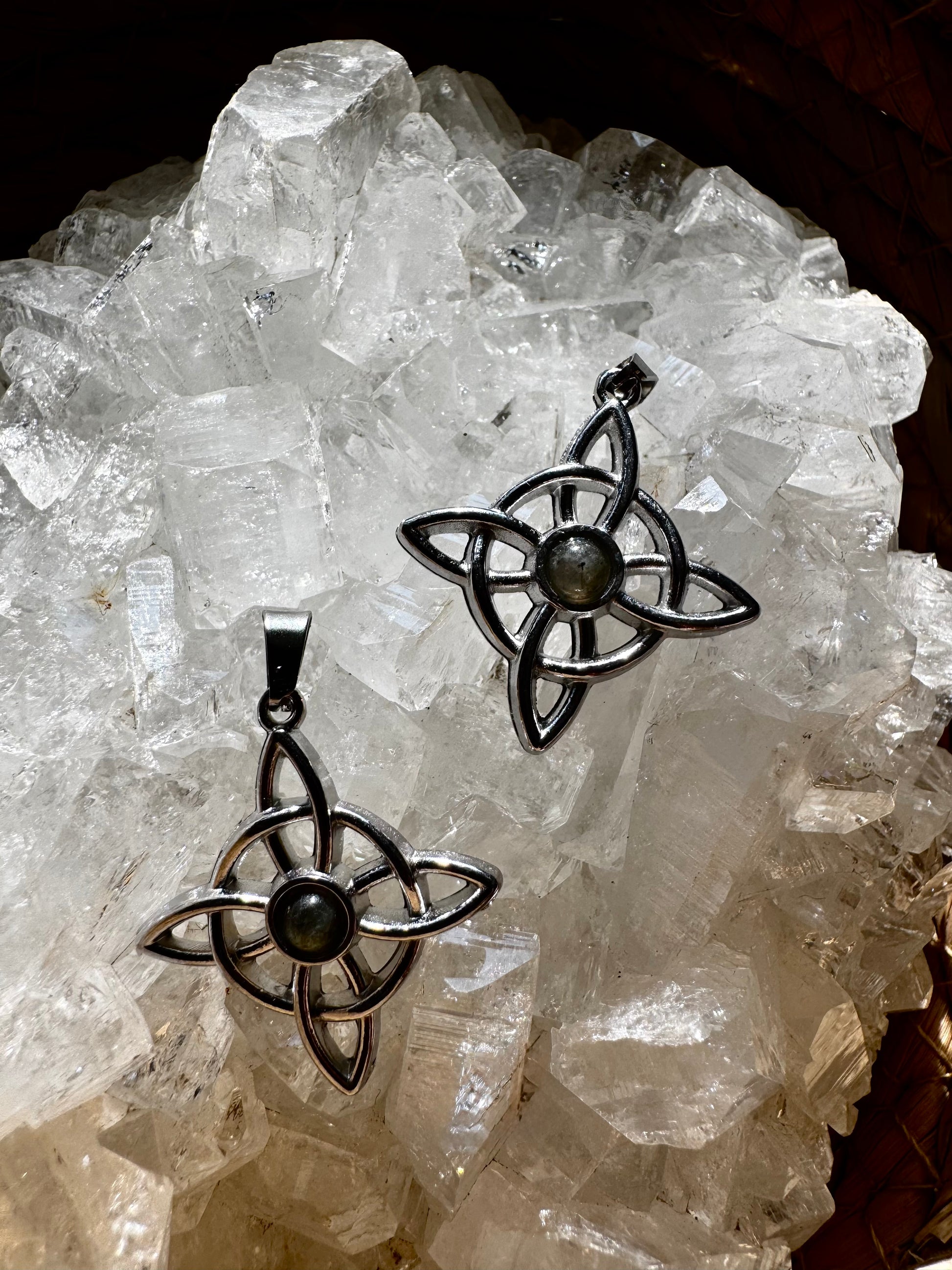 Este colgante de acero combina la fuerza del nudo de bruja, símbolo ancestral de protección y unión con la energía mágica de la labradorita, piedra del despertar espiritual y del poder oculto.