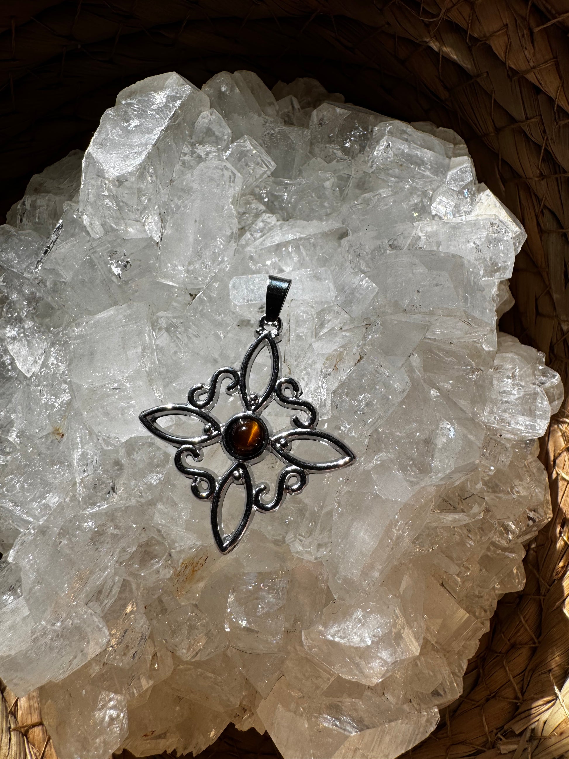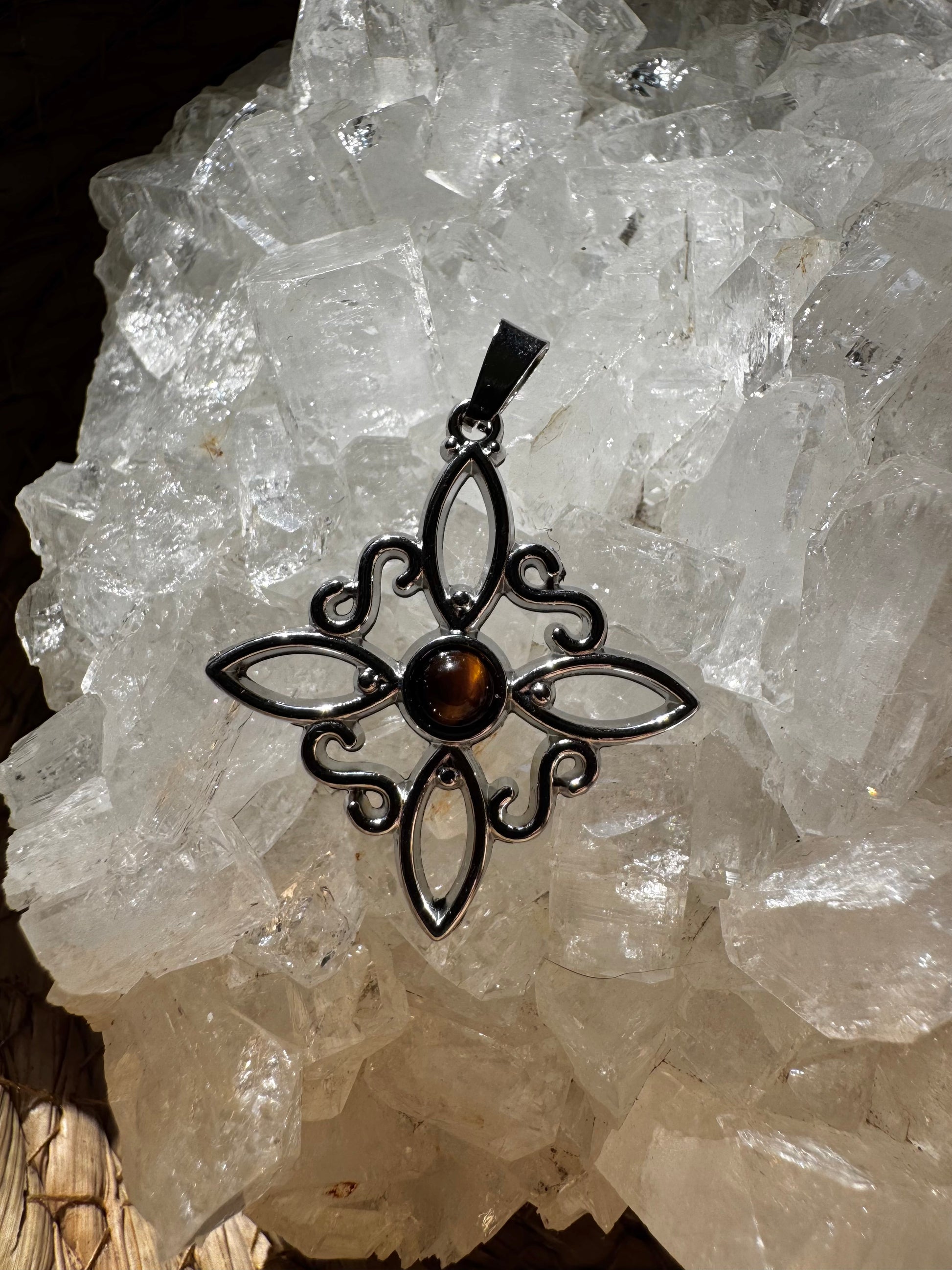 Este colgante de acero une el poder protector del nudo de bruja, símbolo de unión y resguardo, con la energía terrenal del ojo de tigre, piedra de fuerza interior y claridad mental.