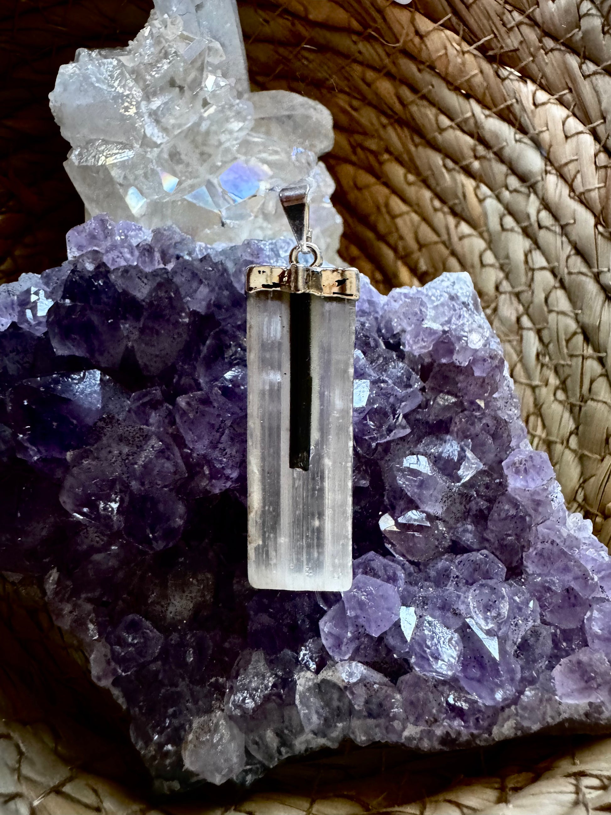 Colgante de Selenita en bruto con Turmalina | Protección y limpieza