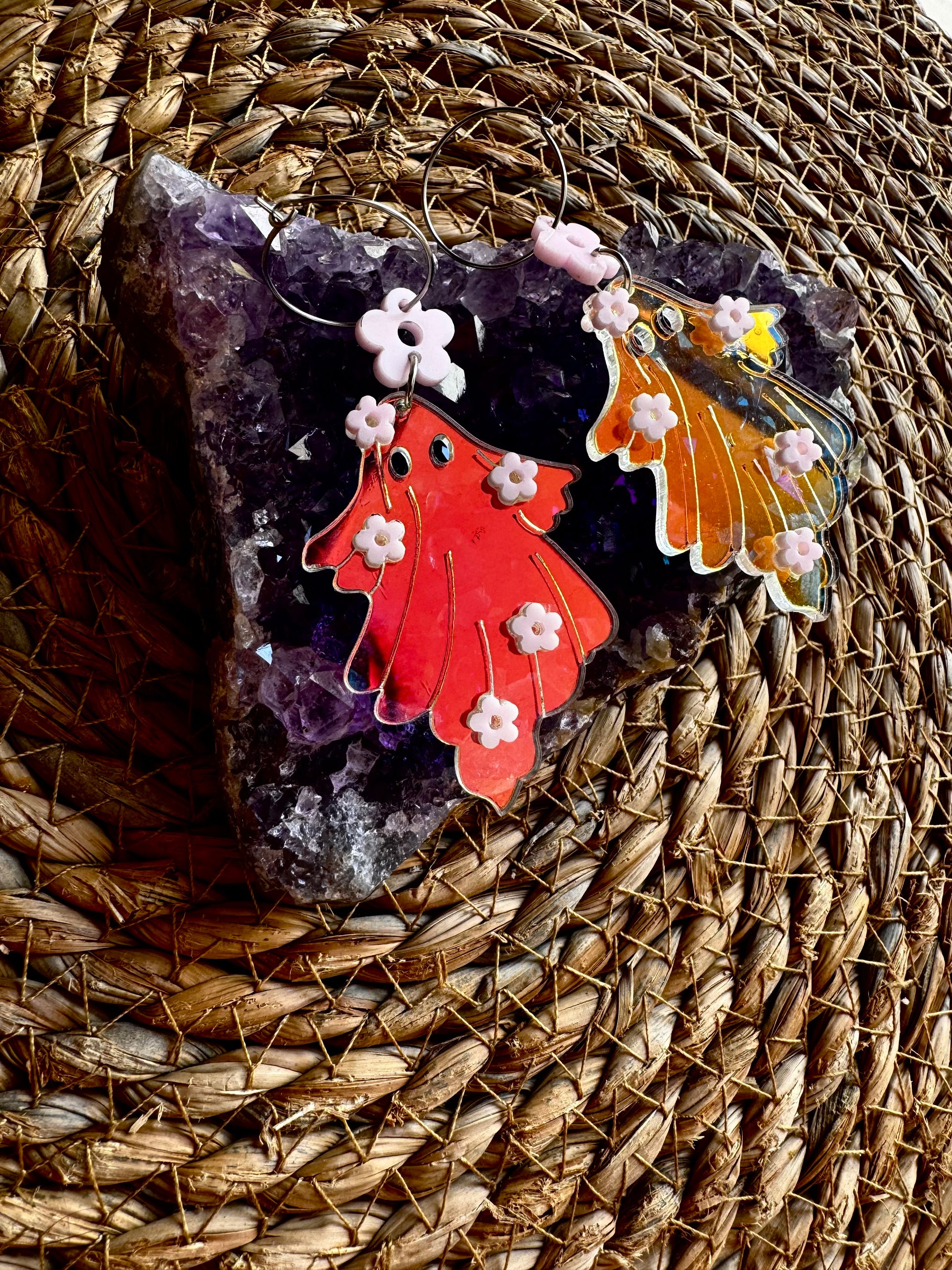Diseño en metacrilato de fantasma con flores, con tonos transparentes e iridiscentes, detalles de flores en rosa palo, hacen de estos pendientes una fantasía.