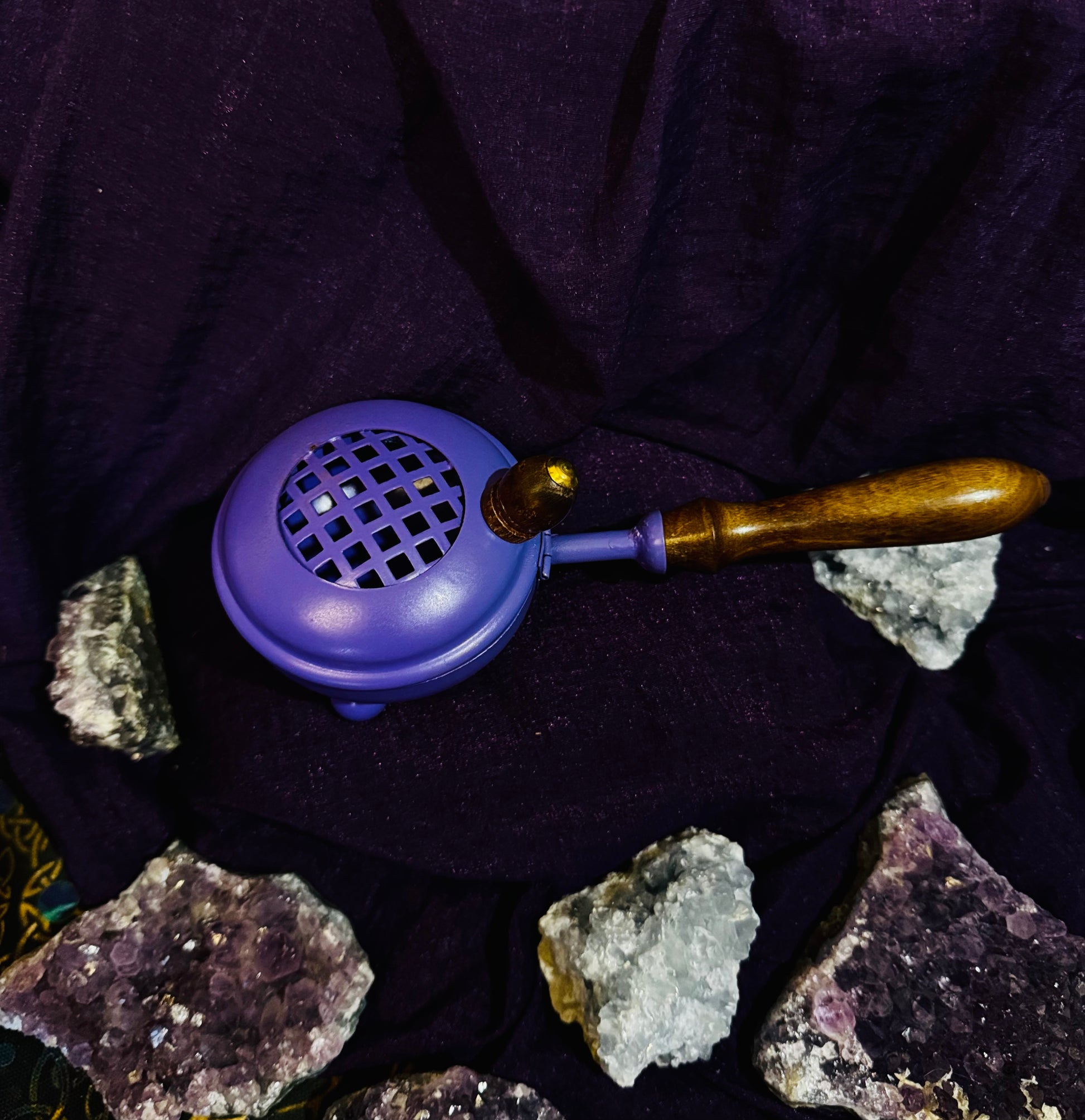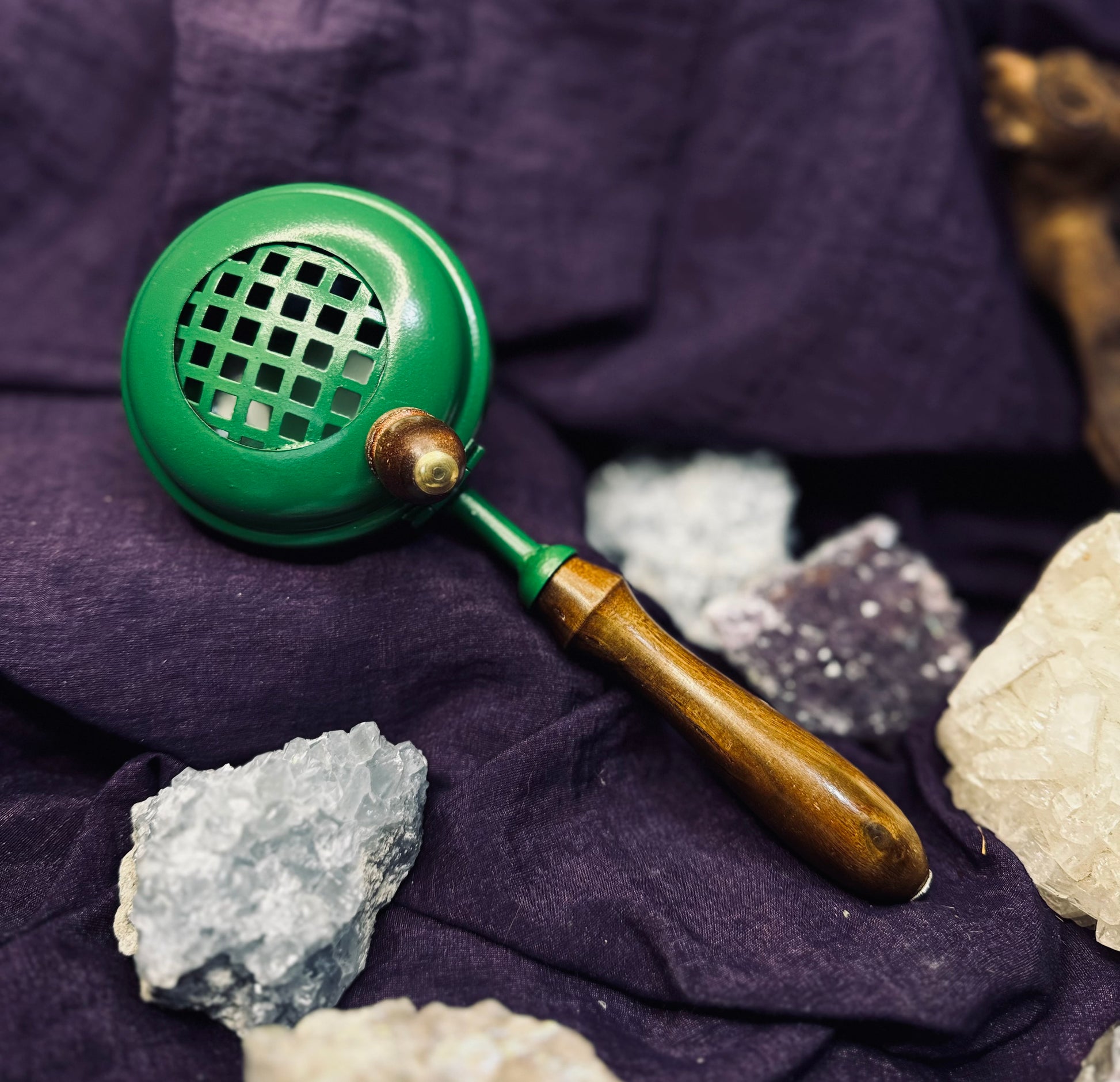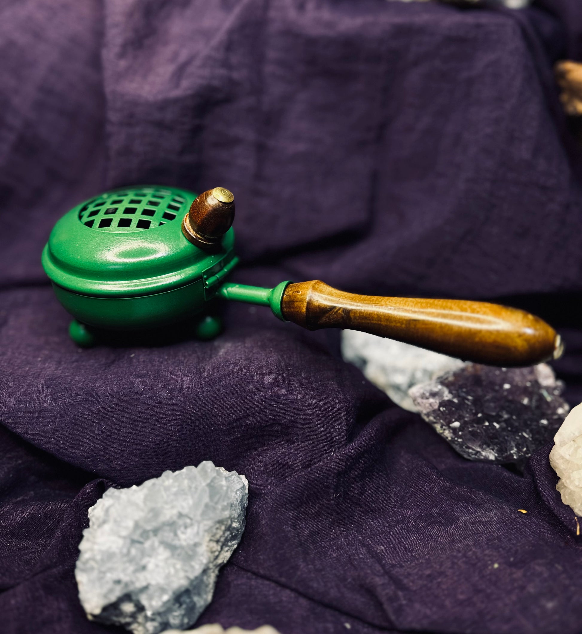Este quemador de incienso metálico está equipado con madera en el mango y pomo para un mejor manejo. Con pies en la base, que garantiza una colocación segura.Su diseño elegante y funcional lo convierte en una adición perfecta para tus rituales de aromaterapia y meditación. Fabricado con materiales de alta calidad, este quemador garantiza una experiencia segura y efectiva para disfrutar de los aromas y beneficios de tus productos favorito.